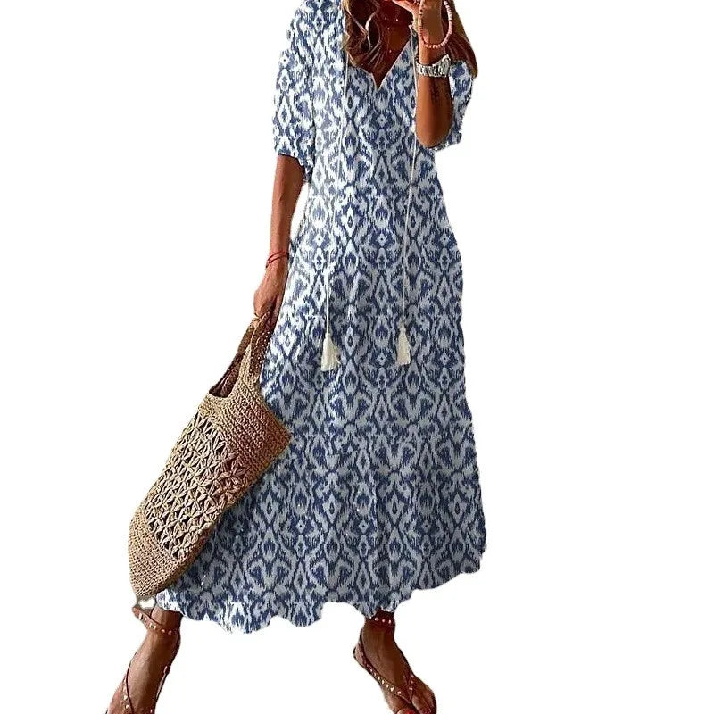 Embrace effortless elegance with this Flower Print Bohemian Dress, a versatile piece designed for the modern woman. Crafted from lightweight polyester, this ankle-length dress features a flattering loose silhouette with a V-neckline and charming petal sleeves that capture bohemian sophistication. The vibrant floral printing adds visual interest while the non-stretch fabric ensures durability and shape retention. Perfect for transitional seasons, this dress transitions seamlessly from beach outings to office settings, party occasions, and holiday celebrations. The loose waistline provides comfortable all-day wear without compromising style. Available in a range of sizes with volume discounts for wholesale and dropshipping partners. Whether you're seeking casual streetwear or elegant occasion wear, this bohemian dress delivers timeless appeal with contemporary flair.